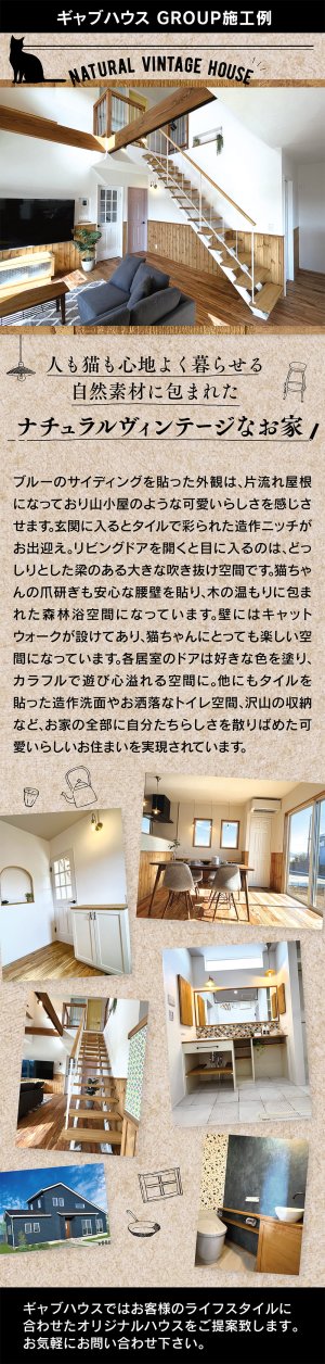 ブルーのサイディングが映える山小屋風住宅。吹き抜けリビングや梁、キャットウォークなど猫と暮らす工夫が満載。造作洗面や収納も充実したデザイン性の高い注文住宅です。