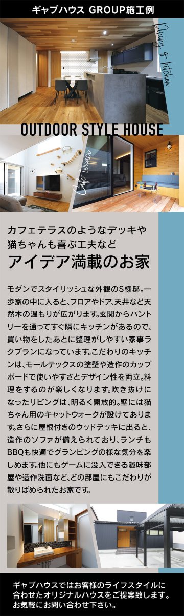 モダンで洗練された外観のS様邸。天然木の温もりある室内と家事ラク動線が魅力。吹き抜けリビングやキャットウォーク、屋根付きウッドデッキで暮らしと趣味を楽しむ住まい。