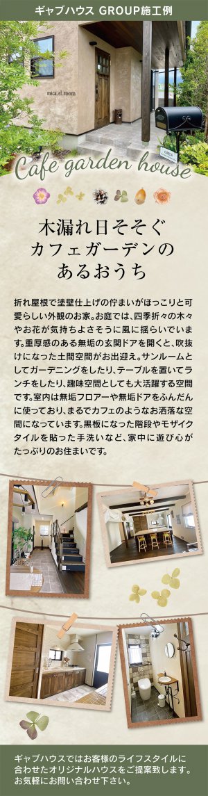 自然素材をなるべく使ったオーダーメイドの家づくりを心掛けています。光熱費を抑える為に断熱性能にもこだわっています。本物の素材で手づくりのキッチン・造作洗面など、オリジナルの空間もご提供しています。新築(注文住宅)・リフォーム・リノベーションのことは、お気軽にご相談下さい。島根県で住宅を建てるなら、島根県浜田市のギャブハウス浜田にお任せ下さい。