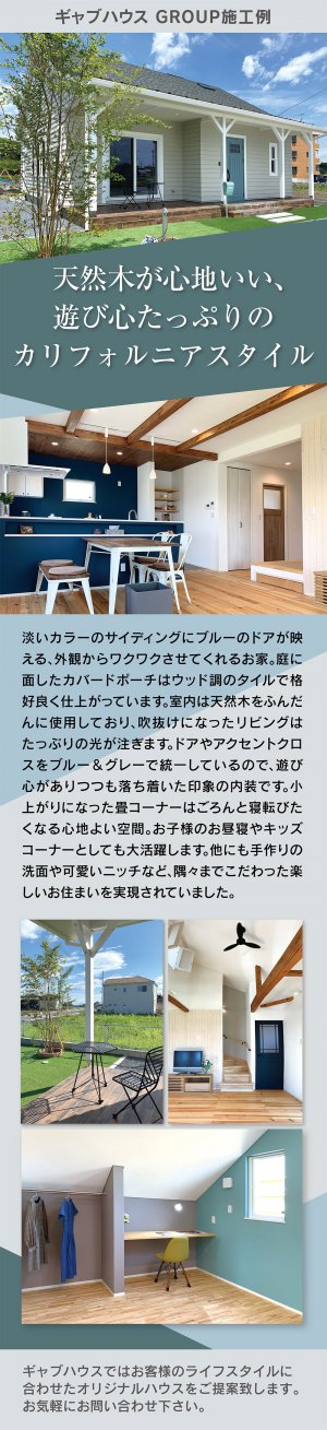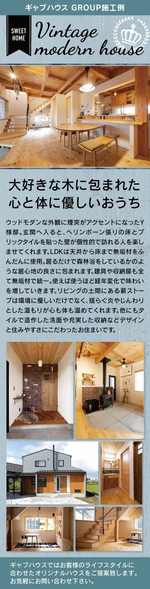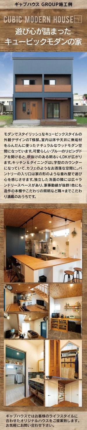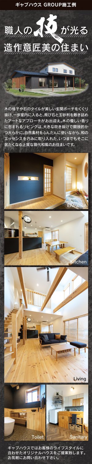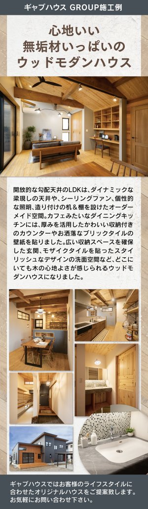 自然素材をなるべく使ったオーダーメイドの家づくりを心掛けています。光熱費を抑える為に断熱性能にもこだわっています。本物の素材で手づくりのキッチン・造作洗面など、オリジナルの空間もご提供しています。新築(注文住宅)・リフォーム・リノベーションのことは、お気軽にご相談下さい。島根県で住宅を建てるなら、島根県浜田市のギャブハウス浜田にお任せ下さい。